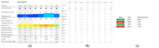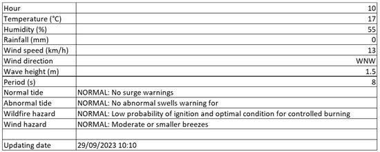 The weather information taken into account encompassed various factors, such as temperature, humidity, wind speed, wind direction, rainfall, tide, and wave data. These data were periodically extracted from Chilean weather forecast websites, namely [94,95], each of which updated their information at varying time intervals. Specific details regarding the frequency of updates for each of these weather parameters can be found in Table 1.