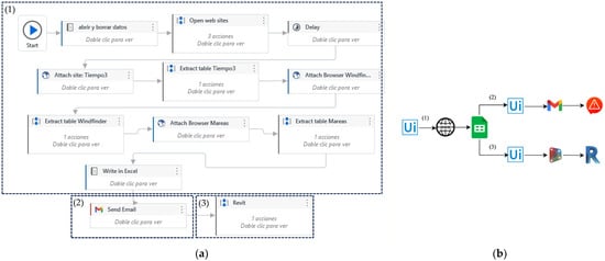 The RPA protocol was developed using the UiPath software [99]. This program has been employed in numerous applications in the literature (as seen in references [100] and [101]), and it was chosen due to the availability of a substantial portion of its functionalities in an unlimited trial mode. The developed code is presented in Figure 7a, and the flow of information is presented in Figure 7b. This protocol includes the following steps: