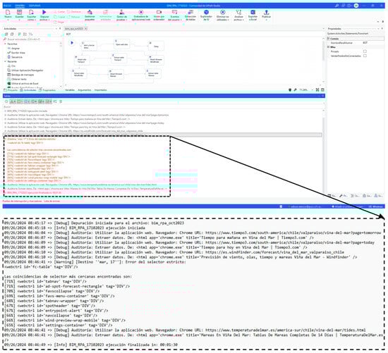 To assess the RPA bot’s performance, a key feature of the RPA tool (UiPath, in this research) is its ability to track each step of the automated process through detailed logs. As shown in Figure 8, UiPath’s output window displays a list of timestamps for each activity performed. These logs can be exported as a text file for further analysis. The highlighted section of Figure 8 shows an identified error that is recorded and can be reviewed to correct the code. Additionally, RPA tools can use these logs to generate more accurate alerts for users, such as detecting specific types of errors using regular expression (RegEx) pattern matching [102].