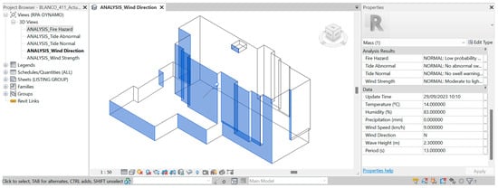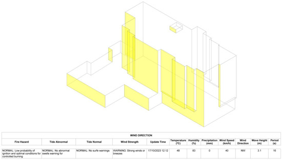 Regarding weather hazard alerts connected with BIM models, it is worth noting the work of Shaharuddin et al. [34], in which temperature measurements were employed to prevent fire hazards. They suggest that IoT sensors hold significant potential for enhancing early fire detection, automating fire prevention and intervention processes, facilitating evacuation and indoor navigation, and enabling the integration of BIM to improve visualization and planning in smart buildings [34]. Despite its importance, the introduction of other weather hazard scenarios, such as the combined impact of wind and temperature in areas adjacent to the building, which could result in fire incidents, or the effects of strong winds and storm surges in the buildings near the coast, into BIM has not yet been incorporated into the literature.