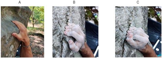 Panel (A) represents the slope grip, panel (B) the half crimp, and panel (C) the full crimp.