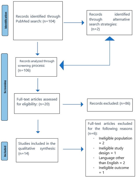 The initial search yielded 104 studies; two studies [22,25] were added through additional bibliography exploration in another article [13]. Subsequently, after reviewing the titles and abstracts, 86 articles were excluded. Following the full-text reading of the remaining 20 studies, 14 were deemed eligible, all in English and meeting the predefined inclusion criteria. The PRISMA Flow Diagram (Figure 2) depicts the entire research pathway, detailing the number of studies analyzed and the reasons for their exclusion.
