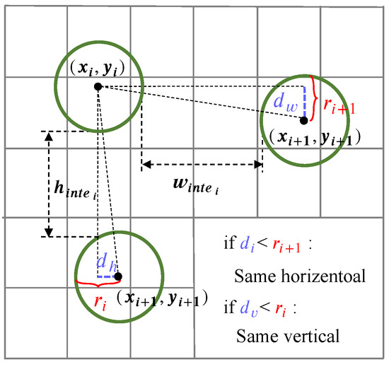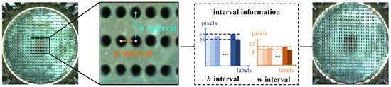 Based on the dataset analysis in Figure 1, the circle objects exhibited a regular arrangement pattern along the vertical and horizontal directions, the horizontal interval size was maintained at 25 to 35 pixels, and the vertical interval was maintained at 8 to 12 pixels, which means that the circles could be extracted row by row and column by column, with the interval prior between the circles in each row and column. Specifically, we selected k annotation files randomly from the dataset of the heat exchanger, and each annotation file contained the coordinates of the circle center point and the width and height of the bounding box. We extracted the interval information of circles within the same rows or columns by checking if the difference in the y coordinate or x coordinate values between the center points of two circles was within the r range, which is shown in Figure 4. represents the vertical deviation between two adjacent circles in the same column, while signifies the horizontal deviation between two adjacent circles in the same row. We determined whether the circles belonged to the same row by examining if both and fell within the radius r, and , were used to represent the horizontal and vertical intervals, respectively. Subsequently, we sorted the central coordinates of circles in the same row or column by y or x, calculating the horizontal intervals and vertical intervals between each pair of circles within each row and column.