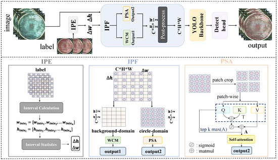 Overall network architecture. This process starts by identifying intervals between circles with the IPE module, combining these data with feature extraction using the IPF module to differentiate circular and background features. The PSA module adjusts the importance of circular features based on diameter and selects key–query–value pairs for attention. A weak coefficient matrix is used to downplay background features. The features are then refined with padding and 1 × 1 convolution before producing the final detection result.