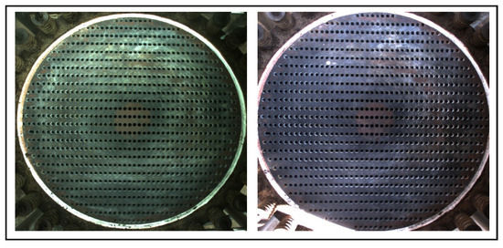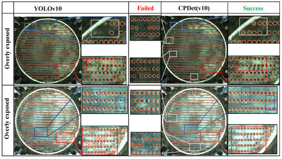 Heat exchangers, known for their necessity in industry, are widely used in almost all large industrial scenarios. Among various heat exchangers, the shell–hole one has reached the largest market share at 49.8% [1]. As a long-standing problem, fouling affects heat exchange efficiency and even disrupts the entire circulation system, resulting in huge energy waste and economic losses. Therefore, regular cleaning of heat exchangers is crucial. Current exchanger cleaning is mainly done manually hole by hole, which is inefficient and time-consuming for large-scale industrial scenarios. Automated cleaning has become an industry trend, and the core of automated cleaning is object detection. Current object detection methods are mainly divided into two-stage and one-stage detection. The two-stage methods [2,3] involve two separate regressions to generate the final output, resulting in low inference speed. One-stage methods [4,5] employ a single regression to produce results. This sample and fast pipeline is more suitable for deployment on various hardware platforms. Therefore, one-stage object detection methods are commonly used in industrial detection scenarios, such as weld spot location in industrial welding [6,7] and the localization of leak positions [8,9]. However, when applying one-stage methods to specific industrial scenarios, the lack of model tuning and customization for these special applications can lead to poor detection performance. For example, in defect detection, the contrast between the defect area and the background is low, and the defect scale varies greatly, resulting in poor localization and classification results. To address this issue, MD-YOLO [10] adopts extra data augmentation and multi-channel fusion modules, significantly enhancing the feature extraction capabilities. Similarly, the variation in object scales captured by drones at different altitudes leads to inaccurate localization. Tph-yolov5 [11] solves this problem by adding custom prediction heads and integrating attention modules. Therefore, enhancing detector adaptability in specific scenarios is critical.