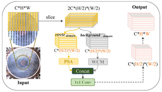 After acquiring the prior interval of circles, this information was integrated into the feature extraction process shown in Figure 6. In the study of extracting image features, ref. [39] applied the slicing technique, were input features were randomly segmented and reassembled, thereby achieving the function of downsampling without discarding information. Drawing inspiration from [39], a special slicing operation was conducted, which is similar to random cropping, but instead of randomly cropping the image, our method utilized the extracted prior information as the step size to guide the slicing of the image, and the input image was sliced into two feature maps: a circle domain map (), which contains a large amount of circle information, and a background domain map (), which contains the most background information, and the specific formula for slicing is as Equation (4). The slice operation was conducted as follows along the vertical starting from 0 and , where every pixel passed and was selected along the horizontal starting from 0 and , every pixel passed, and pixel was selected. Finally, all selected pixels were concatenated to form the final two sub-feature maps and . By emphasizing the features containing a large amount of circle information and reducing the focus on parts with almost background information, this work aimed to enhance valid information and suppress irrelevant information.