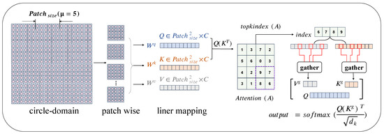 where (default ) defines multiples of the circle–hole diameter, P represents , represents the patch features obtained by dividing the original image, and is three trainable projection weight matrices.