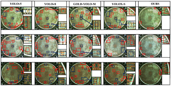 The comparative detection results of different detection models on the heat exchanger dataset: the blue boxes highlight the parts that were incorrectly detected, and the red boxes indicate the sections that were missed during detection.