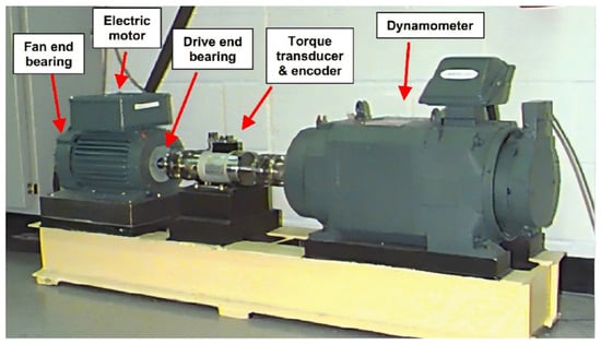 The evaluation was conducted on the CWRU dataset [30], where the bearing experimental system at CWRU is depicted in Figure 3. Single-point defects of specified diameters were introduced on the drive end and fan end bearings (6205-2RSJEM SKF deep groove ball bearings, SKF, Gothenburg, Sweden) and the rolling elements.