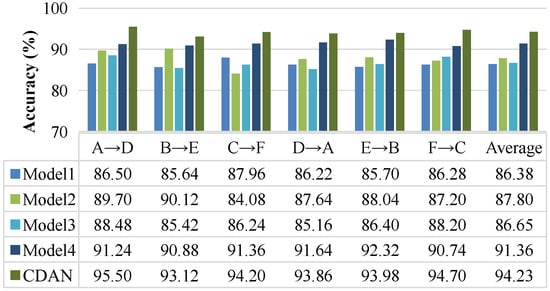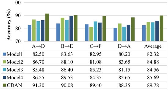 The experimental results on the CWRU dataset are shown in Figure 5. The average training time for the CDAN was 12.67 s, while the average training time for Models 1 to 4 was 30.65 s, 27.81 s, 19.27 s, and 16.89 s, respectively. The average accuracy of fault diagnosis for the comparison methods was 86.38%, 87.80%, 86.64%, and 91.36% respectively. The CDAN achieved an average fault diagnosis accuracy of 94.22%, which is more than 6% higher than Model 1, Model 2, and Model 3, and 2.86% higher than Model 4. Model 3 used an extractor to map features from both source and target domains, while the model proposed in this paper separately set different feature extractors for mapping laboratory samples and real fault samples. The CDAN achieved a fault diagnosis average accuracy 7.85% higher than Model 3, indicating that a model with two feature extractors performs significantly better in recognition performance than a single feature extractor.