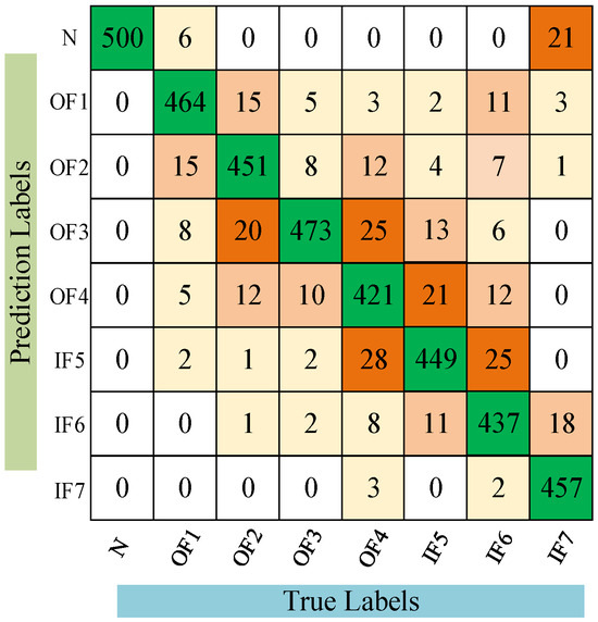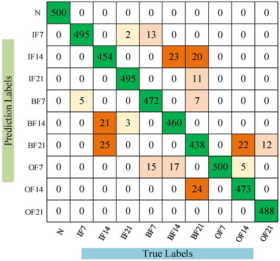 In order to explore the details of CDAN in diagnosing unlabeled bearing faults, the confusion matrix of fault identification results under A→B operating conditions is shown in Figure 10.