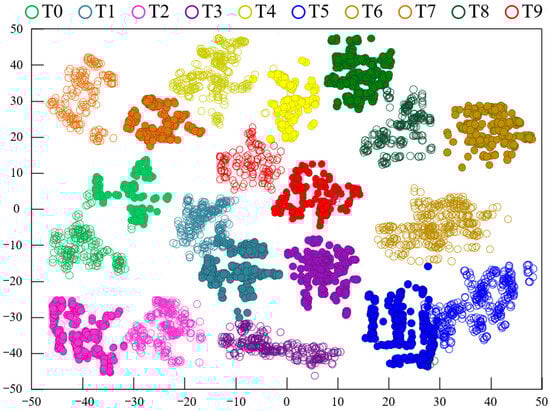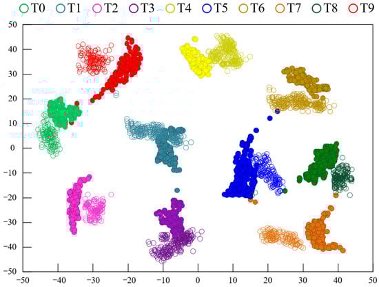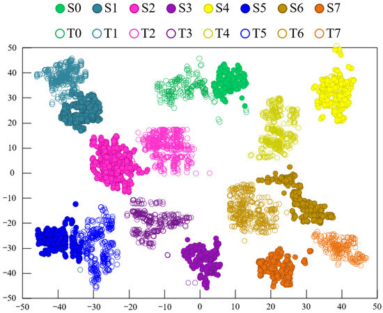 To explore the advantages of using two types of feature extractors for mapping, the t-distributed Stochastic Neighborhood Embedding (t-SNE) method [34] was employed to visualize the features during the data transfer process. The feature visualization results using the CDAN method under experimental conditions A→D are shown in Figure 7, while Figure 8 displays the feature visualization results using the Model 3 method under experimental conditions A→D. A comparison between Figure 7 and Figure 8 clearly shows that the clustering of samples from the same fault category in Figure 7 is more compact, with larger distances between fault category centers, indicating better performance compared to Figure 8. This demonstrates that the proposed model’s fault recognition performance is superior to that of Model 3.