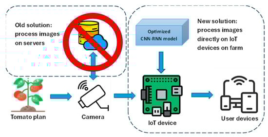 As illustrated in Figure 1, the system captures images of tomato plants using cameras installed on the field. These images are then processed locally by an optimized CNN-RNN model deployed on an IoT device, such as a Raspberry Pi. The lightweight nature of the model ensures that it can run efficiently on these resource-constrained devices, allowing for rapid image analysis directly at the point of capture.