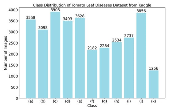 Class distribution of tomato leaf diseases dataset from Kaggle, highlighting data imbalance. All the data classes are listed as (a) Bacterial spot; (b) Early blight; (c) Late blight; (d) Leaf Mold; (e) Septoria leaf spot; (f) Spider mites; (g) Target spot; (h) Tomato yellow leaf; (i) Tomato mosaic virus; (j) Healthy, and (k) Powdery mildew.