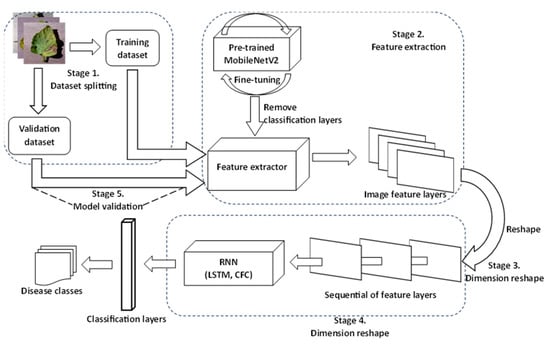 Deep learning models reported in [9] and [16] can identify and categorize fruit images by combining CNN, RNN, and Long Short-Term Memory (LSTM) models to create a multi-model fruit image identification system. The CNN is used to develop discriminative features from the images, while the RNN handles sequential labeling tasks. The LSTM is employed to encode learning at each classification interval, enhancing the model’s understanding of the data. When it comes to disease detection using leaf images, Ref. [17] proposes an approach that leverages pre-trained CNN networks like Xception, VGG16, and InceptionV3 to extract deep features from various fully connected layers. Additionally, an LSTM is employed to capture relationships among these image features. Transfer learning is used to facilitate feature extraction from pre-trained models. The deep features extracted from both the CNN and RNN layers are concatenated and inputted into a fully connected layer.