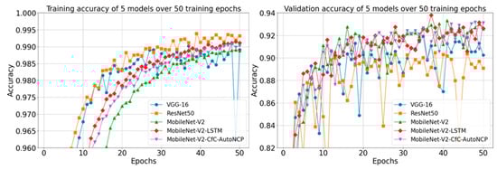 This result shows that the hybrid models outperformed the traditional single CNN models in all performance metrics. The proposed MobileNetV2-CfC-NCP model achieved the highest performance, surpassing the LSTM-based hybrid model that was applied in previous studies [15,17], demonstrating the superior effectiveness of liquid neural architectures over the LSTM in this context.