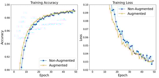Comparison of training accuracy and loss between augmented and non-augmented datasets.