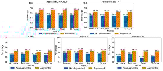 The results in Figure 12 consistently shows that models trained with augmented data outperformed their non-augmented counterparts in terms of validation accuracy, precision, recall, and F1-score. This reinforces the conclusion that data augmentation significantly enhances the generalization ability of machine learning models, making them more effective in handling new, unseen data.