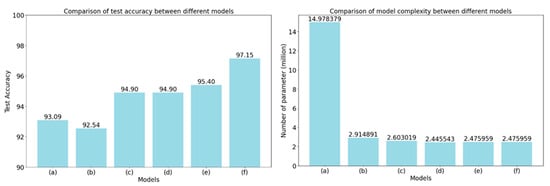 Comparison of test accuracy and model complexity across different models: (a) VGG-16; (b) MobileNetV2; (c) MobileNetV2-LSTM; (d) MobileNetV2-CfC; (e) MobileNetV2-CfC-NCP; (f) MobileNetV2-CfC-NCP (Augmentation).