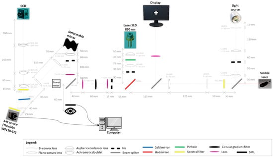 An adaptive optical system with an in-house Hartmann–Shack aberrometer (Thorlabs WF150-7AR), previously developed in the Centre of Physics of the University of Minho, was used to measure ocular aberrations in real-time while inducing accommodation (Figure 1). The accommodation was stimulated with negative lenses (−1.00 D, −2.50 D and −5.00 D) allocated to a motorized system (SML). The aberrometer had a resolution of 1280 × 1024 and 39 × 31, operating at a frequency of 10 Hz. The super-luminescent diode (SLD) used to generate the optical beam had a power of 10 µW (L8414-04, Hamamatsu, Shizuoka, Japan) at the eye, with a spectral maximum at 830 nm. The beam within the wavefront sensor was approximately 4 mm, with an effective diameter of 2 mm used to measure ocular aberrations.