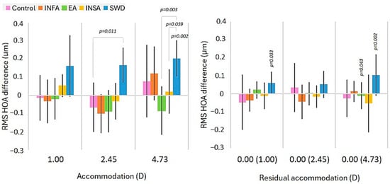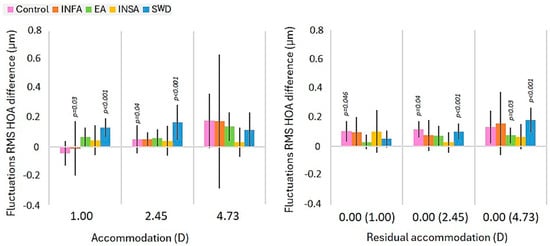Fluctuations in the RMS HOAs were also analyzed and their changes with different stimuli compared to the initial state are shown in Figure 4. The control group suffered a significant increase in microfluctutions at the 2.45 D stimulus (0.053 ± 0.201; p = 0.04) and SWD at 1.00 D (0.134 ± 0.125; p < 0.001) and 2.45 D (0.171 ± 0.245; p < 0.001), whereas the INFA group significantly decreased at the 1.00D stimulus (−0.010 ± 0.172; p = 0.03). Regarding this parameter for the residual accommodation state, a significant increase in the microfluctuations of RMS HOAs was observed in the control group after disaccommodating 1.00 D (0.104 ± 0.115; p = 0.046) and 2.45 D (0.053 ± 0.201; p = 0.04), as well as in the EA group after the 4.73 D (0.077 ± 0.069; p = 0.03) stimulus was removed and in the SWD after the 2.45 D (0.104 ± 0.116; p < 0.001) and 4.73 D (0.183 ± 0.145; p < 0.001) stimuli were removed.
