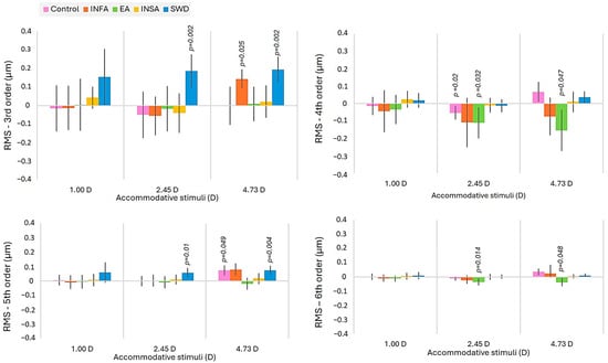 Figure 3 presents the variations in RMS, from the 3rd to 6th orders with accommodation, and the differences between the initial relaxed state and the residual accommodation after removing the stimulus are shown in Table 2. Regarding the changes with accommodation, the control group suffered significant changes in 4th-order RMS at 2.45 D (p = 0.02) and 5th-order RMS (p = 0.049) at 4.73 D, the INFA group in 3rd-order RMS at 4.73 D (p = 0.025), the EA group in 4th- and 6th-order RMS at both 2.45 D (4th-order, p = 0.032; 6th-order, p = 0.014) and 4.73 D (4th-order, p = 0.047; 6th-order, p = 0.048), and SWD in 3rd-order RMS at 2.45 D (p = 0.002) and 4.73 D (p = 0.002), and in 5th-order RMS at 2.45 D (p = 0.01) and 4.73D (p = 0.004). In addition, the increase in 3rd-order RMS at 2.45 D (p = 0.003) and 4.73 D (p = 0.025) in the SWD group was significantly higher than the variation in the control group.