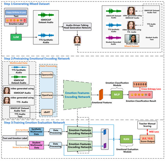 This study follows up on the previous research on the evaluation of emotion in audio by developing a method based on multimodal information fusion and emotion characterization for the emotion analysis and evaluation of audio and video of students’ emotional expressions in their second language. First, the text and emotion labels in the IEMOCAP dataset are utilized to synthesize emotionally rich corresponding audio data by an LLM. Subsequently, the synthesized audio data and the audio in the IEMOCAP dataset are used to generate a speaker video that matches the corresponding audio through the speaker video generation model, and that is combined with the student audio and video to build a comprehensive dataset. Then, the emotion feature encoding network is introduced, which is based on multimodal information fusion, to extract the emotion features from multimodal data. Finally, a KAN-based network for evaluating linguistic emotional expressions is designed to achieve a regression analysis and accurate evaluation of students’ second language emotional expressions by training on the emotion features extracted from multimodal information based on scoring by professional teachers. This chapter will subsequently detail the differences with citation [26], in that citation [26] mainly focuses on single audio information, while this paper integrates multimodal information. Figure 1 is an illustration of the overall framework, which has three parts.