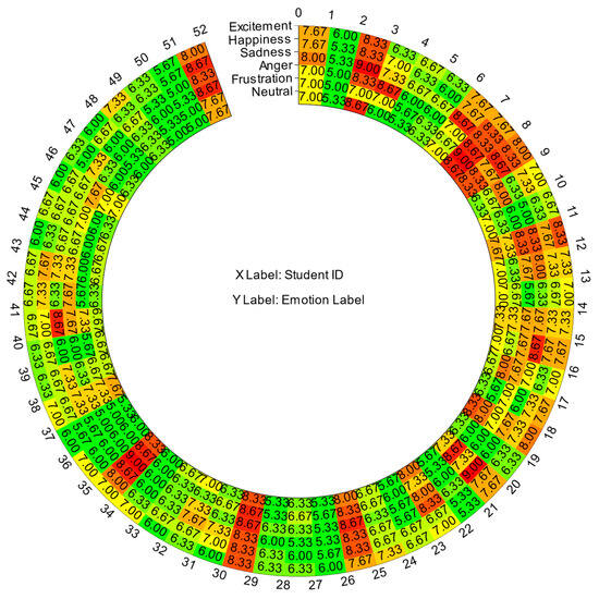 In order to apply the language learning emotion evaluation method proposed in this study to real teaching scenarios, 18 emotionally representative audios were selected from the IEMOCAP dataset. These audios covered six categories of emotions. Subsequently, 52 second language learners recorded 936 video and audio samples based on the content and emotions of these audios. Unlike citation [26], the emotion scoring in this paper is not only for audio, but also comprehensively evaluates the emotional performance on video. We assembled a group of English teachers to evaluate the emotional fullness of the students’ audio and video. These teachers’ scores were utilized as criteria for training and evaluating the affective evaluation model. The average performance of each student for each emotion category is shown in Figure 2. On the heatmap, scores are distinguished by color to differentiate between good and bad emotional expression, with red representing high scores and green representing low scores. Differences in color and shade show the distribution and intensity of students’ emotional expression.