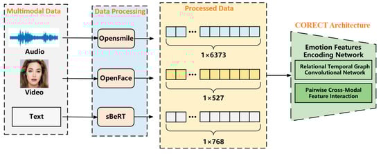 In the feature extraction stage, this paper integrates the structure by the CORECT method to encode the emotion features. Firstly, global temporal features of video, audio, and text are extracted by a RT-GCN [30] to capture the long-term dependencies in each modality of information. Second, this paper uses Pairwise Cross-Modal Feature Interaction [30] to capture local features between different-modality information. The specific steps are listed below.