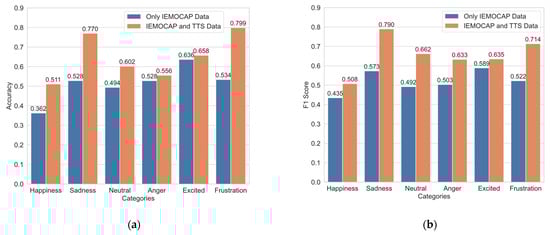 Graph of the results of the emotion recognition model: (a) Comparison of accuracy before and after adding TTS data based on IEMOCAP dataset; (b) comparison of F1 score before and after adding TTS data based on IEMOCAP dataset.
