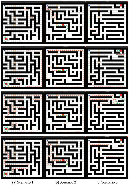 The model is compared with the A* search algorithm, RRT algorithm, and QL algorithm, while the rolling online algorithm is used to supplement the traditional algorithm. The comparison results are shown in Figure 3. In order to adapt to a four-way proxy, the A* search algorithm combines a linear function and the Manhattan distance as the heuristic function. The RRT algorithm selects the nearest node to join the tree after obstacle judgment. The QL algorithm combines the average rolling algorithm to complete the test, which is different from the proposed method. All algorithms only search online on the map without being trained beforehand. From Figure 3, it can be seen that the A* search algorithm cannot adapt to real-time scenarios, and the agent is easily trapped in deadlock situations, resulting in its inability to complete tasks. Due to the lack of a target decision process, the generalization ability of the RRT algorithm could be improved in different scenarios, and the algorithm often cannot continue due to stuttering during runtime. The QL algorithm and the proposed method can complete planning and produce coverage search paths, but the proposed method performs better when searching for the target.