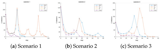 Comparison of changes in values between different algorithms. (a–c) Numerical statistical results of of four algorithms in Scenario 1, Scenario 2, and Scenario 3, measuring ability to search for target.