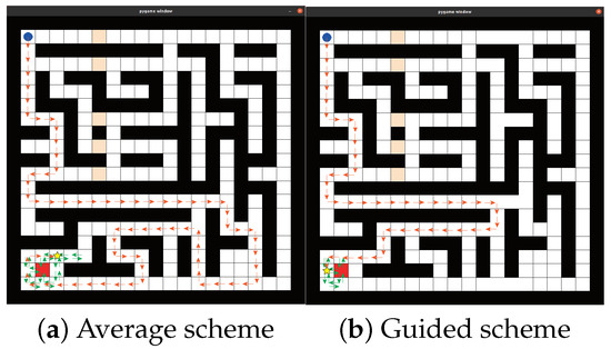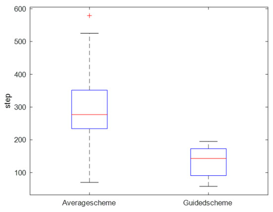 According to the planning results of sub-section A, the improved algorithm is smaller than the conventional QL planning algorithm in terms of running step size. In addition, the QL algorithm has a high repetition coverage rate. The target decision algorithm can play a good role in assisting with decision making. To evaluate whether the corresponding parameters of the target decision algorithm can effectively assist in the decision problem when the target position is uncertain, 20 simulation experiments were carried out in the mine SAR scenario in Figure 5. Figure 5 shows that the median set of step size of the guidance scheme is smaller than that of the average scheme. In addition, the step sizes of guidance schemes is concentrated below 200, and the data fluctuation is not significant. In contrast, the step sizes of the average scheme are discretely distributed between 225 and 375, resulting in significant data fluctuation. The above results illustrate that the guided solution has a better adjustment effect on the target decision algorithm.