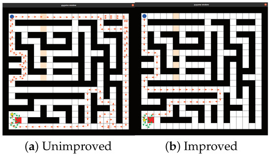 The data for different solutions are shown in Table 2. Figure 7 shows the performance of planning operation steps under different reward function solutions. The same curve trend can be observed between the unimproved and improved solutions, indicating that these two solutions play a role in solving obstacle avoidance and goal orientation. However, the convergence speed of the improved solution is faster. Meanwhile, the search path-planning results under different schemes are shown in Figure 8. During the learning process, the learning speed of the unimproved solution is slower, resulting in inaccurate planning multiple times. The improved solution provides more accurate results than the unimproved one during the learning process. It reduces the repetitive path rate of the agent and improves the efficiency of online planning. This proves that the reward function is goal-oriented for the intelligent agent, enabling it to learn gradually.