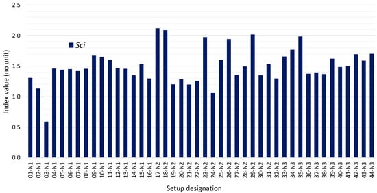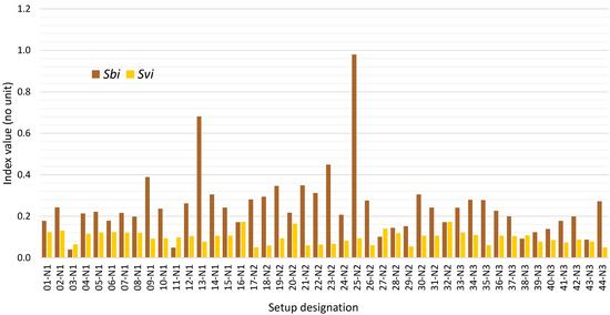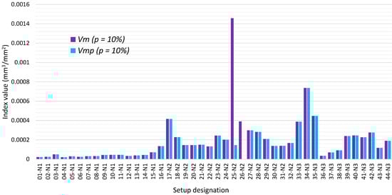 The values of the volumetric indices are shown in Figure 8, Figure 9 and Figure 10 for all 44 setups studied.