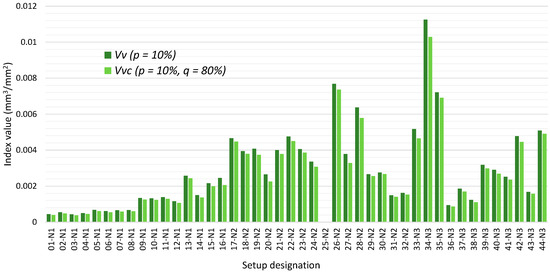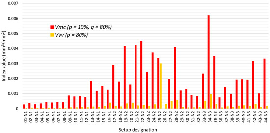 The following indices were selected to assess the influence of changes in machining parameters on the development of volumetric indices of the geometric texture of surfaces [47,48]: