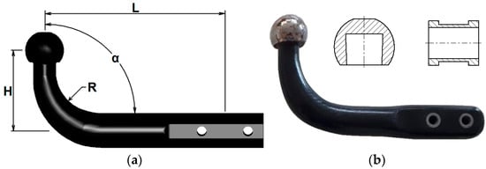 The most common towing hooks used in cars are L-shaped ones (Figure 2). The dimensioning of a hook is carried out taking into account the load it must support, but it must also take into account the rear bumper that it must bypass, so that the length L is considered to be the distance between the center of the sphere and the middle of the distance between the two holes, and the height H is the distance between the center of the sphere and the axis passing between the two holes (Figure 2). The diameter of the hook sphere is set by the standards at 50 mm.