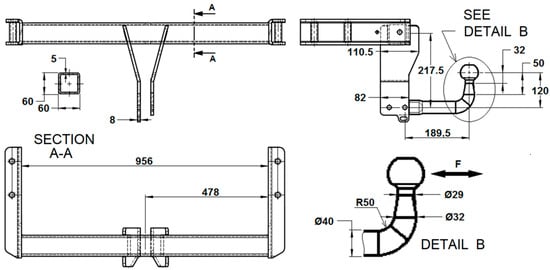 The towing system chosen to carry out the theoretical and experimental research is equipped with a simple towing hook, fixed with two screws to the central flanges on the resistance beam. The dimensions, necessary for this study, of the towing system for which mechanical resistance calculations are performed are shown in Figure 3.