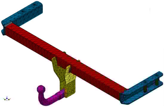 The resistance beam and the flanges welded to it have simple geometry, which can be represented via discretization by 2D surfaces or even 1D lines in the case of the beam and outer flanges. Instead, the geometry of the tow hook is variable along its entire length, making it inefficient to discretize this model into lines or surfaces. Therefore, the discretization of the entire towing system is carried out with 3D volume elements, an advantageous variant both for satisfying the requirement given by the geometry of the hook and, visually, for interpreting the method of deformation of the entire towing subassembly. Following the classical calculations, it is observed that the most loaded component in the structure of the towing system is the hook. As a consequence, two analyses are carried out in parallel, both of the entire towing system and, on a specific basis, only of the towing hook.