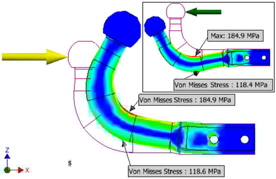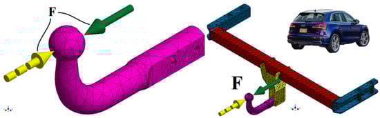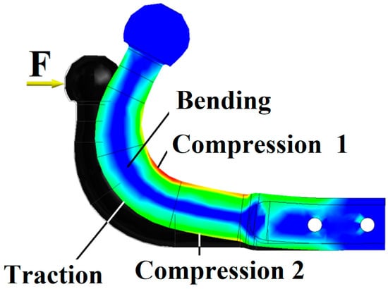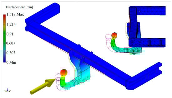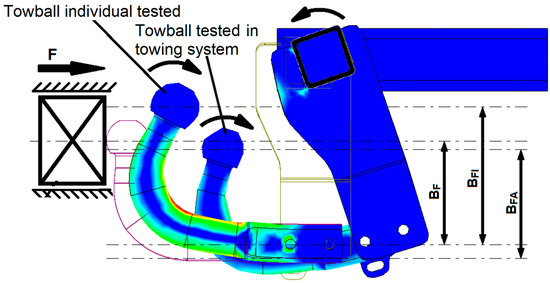 - The torsion of the beam tends to cancel out the displacement of the sphere. It can be seen in Figure 13 that the deformation of the hook is achieved by bending in the clockwise direction, and the deformation of the beam is achieved in the opposite direction of rotation (along with the entire towing hook). Therefore, this composition of displacements tends to return the hook sphere to its original position. The return to the initial state of the ball is not achieved because the displacement from the bending of the hook is more pronounced than the reverse displacement given by the torsion of the beam; therefore, the ball tends to move towards the vehicle.