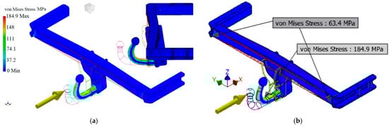 (a) Deformation mode and (b) von Mises stresses appearing in the towing hook and strength beam.