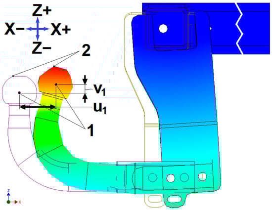 - The maximum displacement occurs at the top left point of the flattening on the hook sphere. The point marked with ‘2’ in Figure 13 represents the place where the most pronounced displacement of the towing system takes place—this point is of less interest in the displacements in the system. The point marked with ‘1’ in the same figure represents the specific point of the center of the sphere, its displacement making the object of interest.
