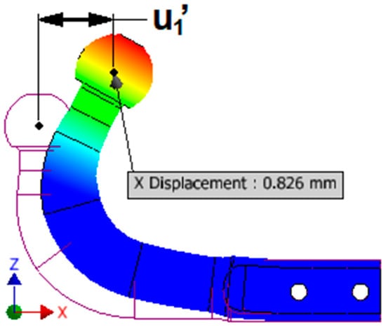 Regarding deformation of the towing hook, in Table 3 the specific displacement of the center of the sphere horizontally u1′ and vertically v1′, respectively, is observed. Figure 14 shows the displacement of the single towing hook, considering it embedded in the area of the fixing holes.