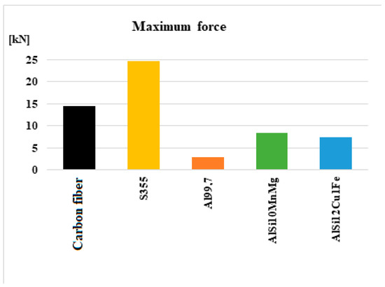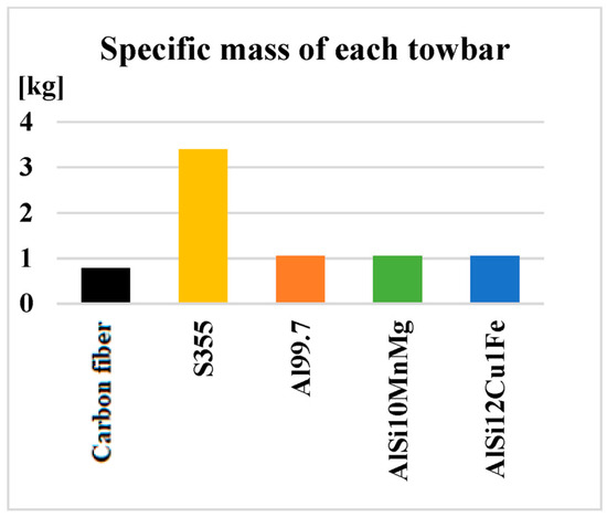 On the other hand, regarding the situation in terms of the specific mass of each type of towing hook, it can be said that the most disadvantageous hook is the one made of steel, and the product with the lowest mass is the one made of carbon fibers. Aluminum and silumin hooks have a mass closer to that of a carbon fiber hook and very far from that of a steel hook.