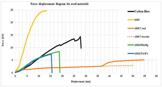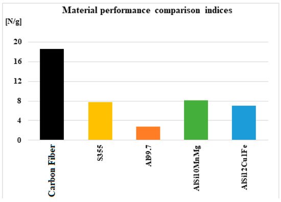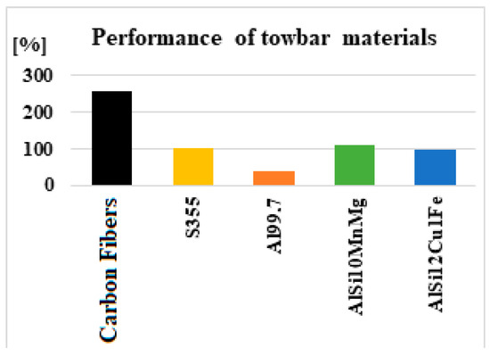 When the strength of the hook is related to its mass (in the case of the same material), material performance indices are obtained, showing that the CFRP model is 2.5 times more efficient than S355, AlSi10MnMg 11% more efficient, and AlSi12Cu1Fe 3% below the performance of steel. These values provide guidance to researchers in the field of alternative materials for making tow hooks. Certainly, if CFRPs were improved, and also AAl, in order to obtain more homogeneous models, even higher performances would be obtained compared to those of steel.