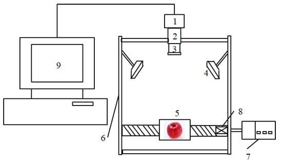 - Zhang, H.; Chen, K.; Su, D.; Hu, J.; Zhang, Z. Design of nondestructive detection device for moldy core in apples based on characteristic spectrum. Trans. Chin. Soc. Agric. Eng. 2016, 32, 255–262. [Google Scholar]