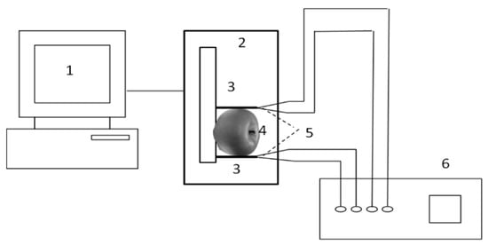Schematic of experimental apparatus to measure dielectric property. 1. computer; 2. shielding box r; 3. two parallel iron plates; 4. sample; 5. clip test probe; 6. LCR teste.