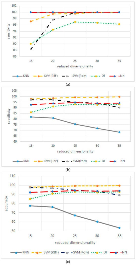 The effect of the reduced dimensionality on the detection performance. (a) The effect of the reduced dimensionality on the sensitivity. (b) The effect of the reduced dimensionality on the specificity. (c) The effect of the reduced dimensionality on the accuracy.