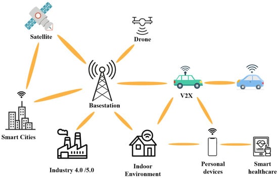 In recent years, there has been a noticeable increase in research and development in the high-frequency domain, specifically the millimeter-wave (mmWave) frequency band [1,2,3]. This surge is a part of a continuous pursuit to surpass the limitations of data transmission speed and network capacity, with a particular focus on the development of the next-generation mobile communication system, 5G. 5G promises not only superior speed compared to existing 4G LTE (Long-Term Evolution) systems but also lower latency and higher data rates over a wider frequency range [4,5]. 5G technology is designed to support various data-intensive applications such as autonomous vehicles, artificial intelligence, and the Internet of Things (IoT), all of which require high-speed internet connections [6]. The recent and upcoming 5G millimeter-wave applications are demonstrated in Figure 1.