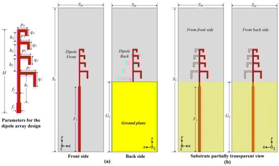 The dipole array antenna: (a) a view of the individual sides and (b) a partially transparent view of the substrate.